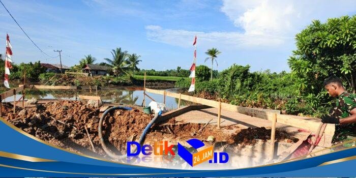 Tanah Laut – Permudah mobilisasi dalam pembangunan Jembatan Garuda di Desa Handil Labuan Amas, Kecamatan Bumi Makmur, Kabupaten Tanah Laut, personel Kodim
