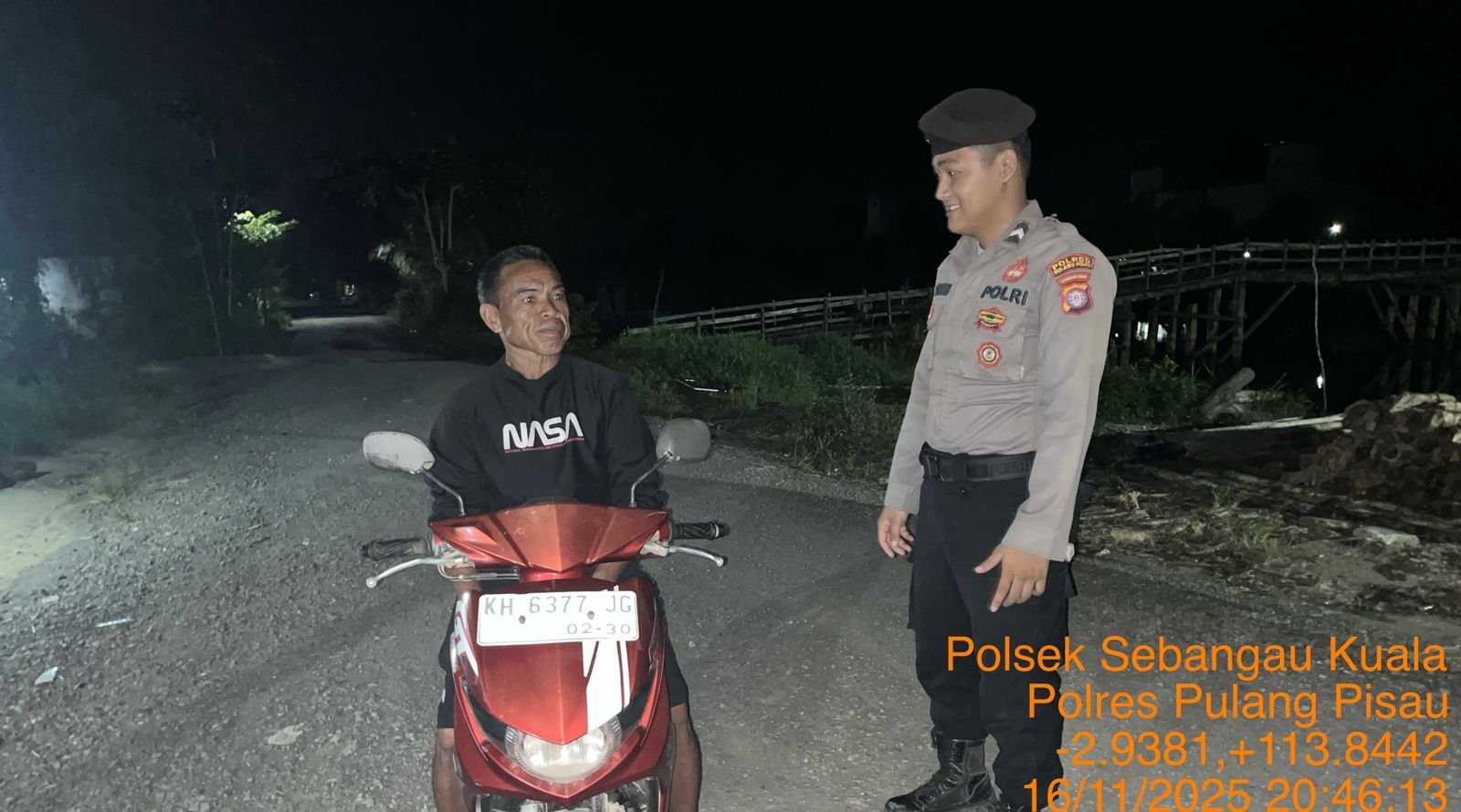 Polres Pulang Pisau-Polsek Sebangau Kuala, Polres Pulang Pisau, Polda Kalimantan Tengah – Salah satu Upaya Kepolisian dalam rangka memelihara sitkamtibmas yang kondusif di wilkum, Polsek sebangau kuala, Polres Pulang Pisau, Polda Kalteng, kembali menggelar Kegiatan rutin yang ditingkatkan ( KRYD ) di Desa sebangau permai, Wilayah Kecamatan sebangau Kuala, Minggu (16/11/2025) Malam.