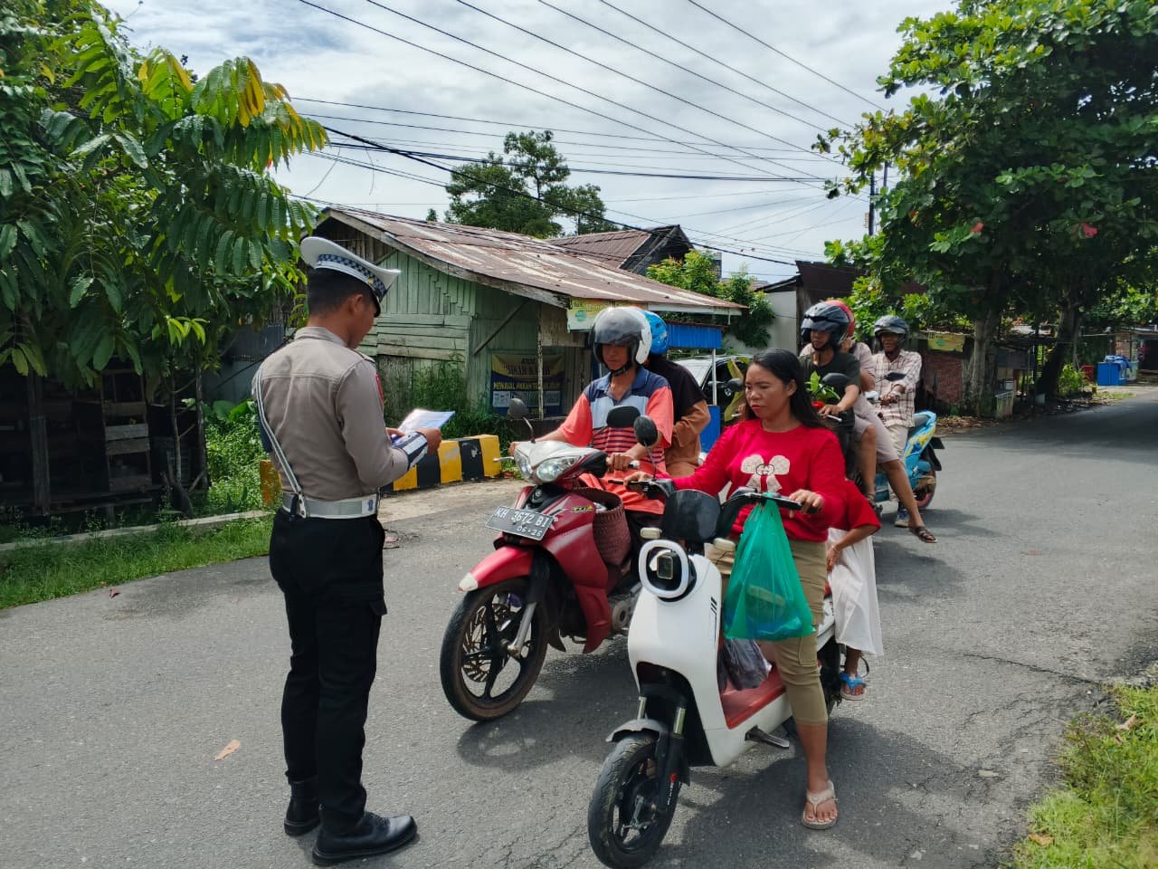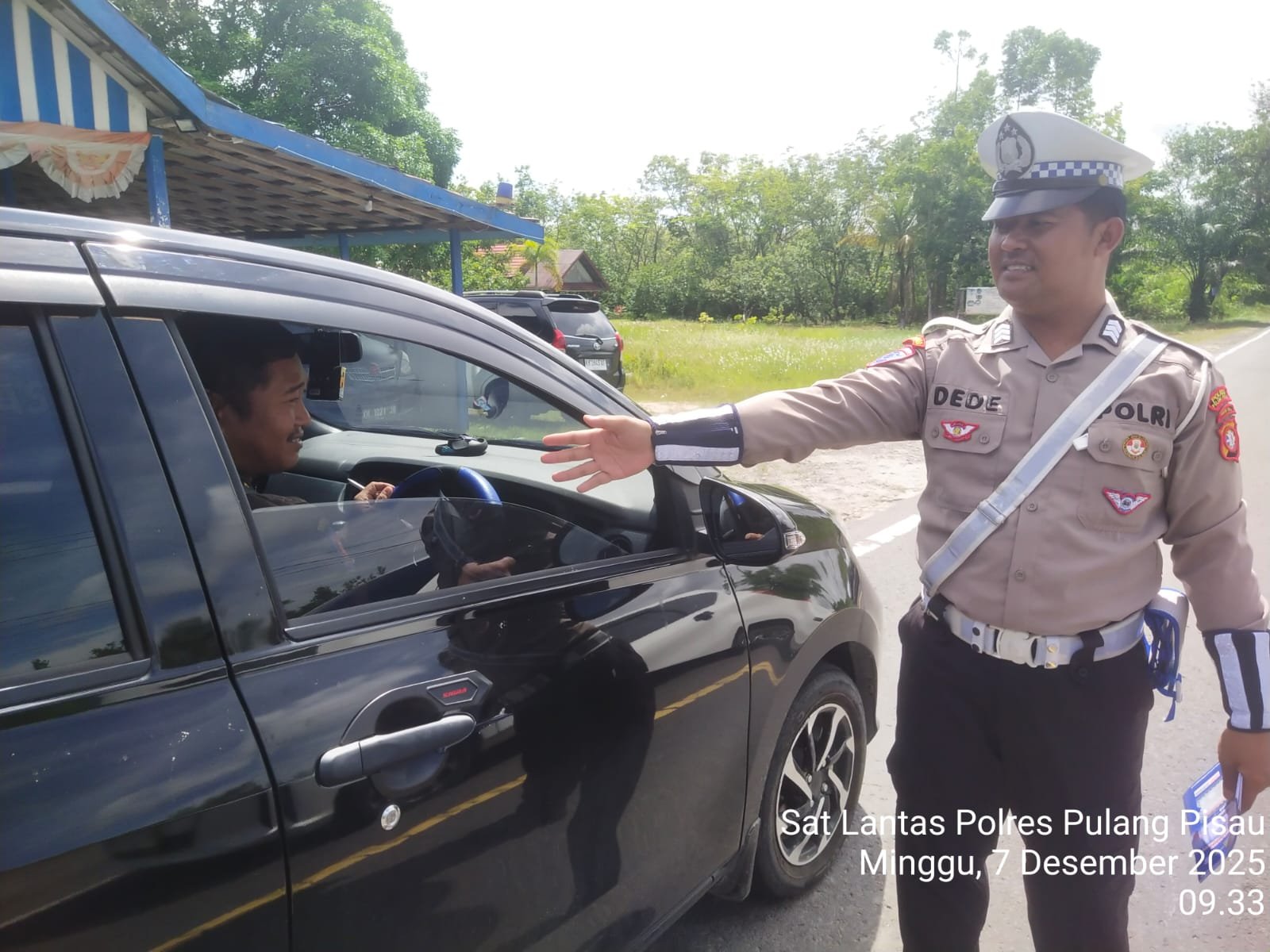 Polres Pulang Pisau – Satuan Lalu Lintas – Dengan Senyuman yang ramah Personel Satlantas Polres Pulang Pisau mengingatkan pengendara roda dua agar selalu klik helm saat berkendara. Minggu (7/12/2025).