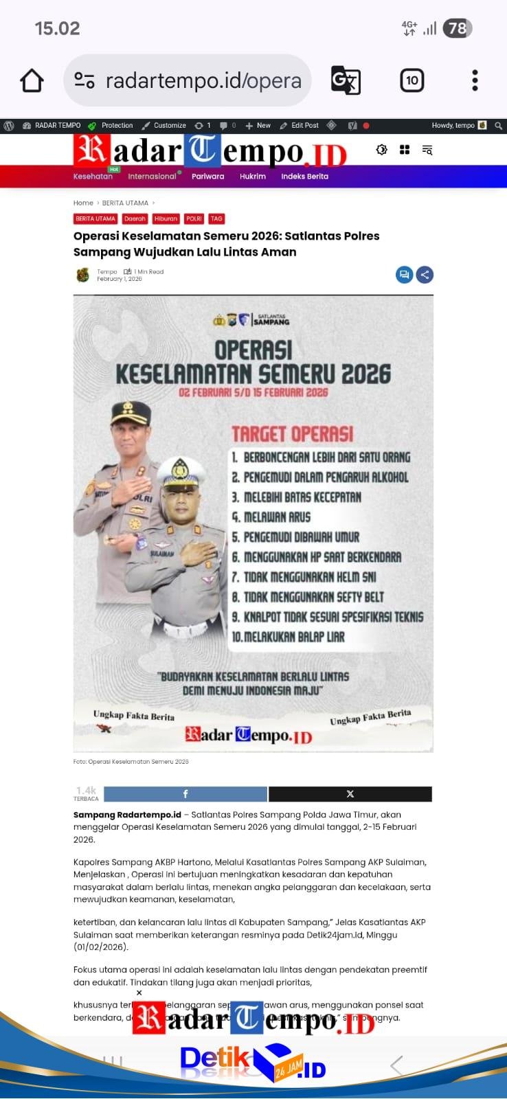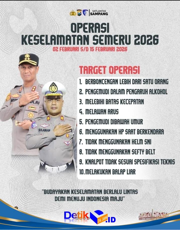 Sampang || Detik24jam.id – Satlantas Polres Sampang Polda Jawa Timur, akan menggelar Operasi Keselamatan Semeru 2026 yang dimulai tanggal, 2-15 Februari 2026.