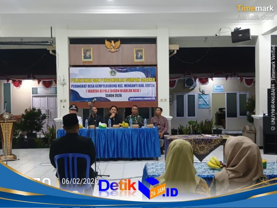 Gresik || Detik24jam.id – Pemerintah Desa Gempolkurung, Kecamatan Menganti, Kabupaten Gresik, menggelar prosesi Pelantikan dan Pengambilan Sumpah Jabatan Kepala Dusun (Kasun) Ngablakrejo, Jumat (6/2/2026). Kegiatan yang berlangsung di balai desa setempat tersebut berjalan khidmat, tertib, dan penuh makna.