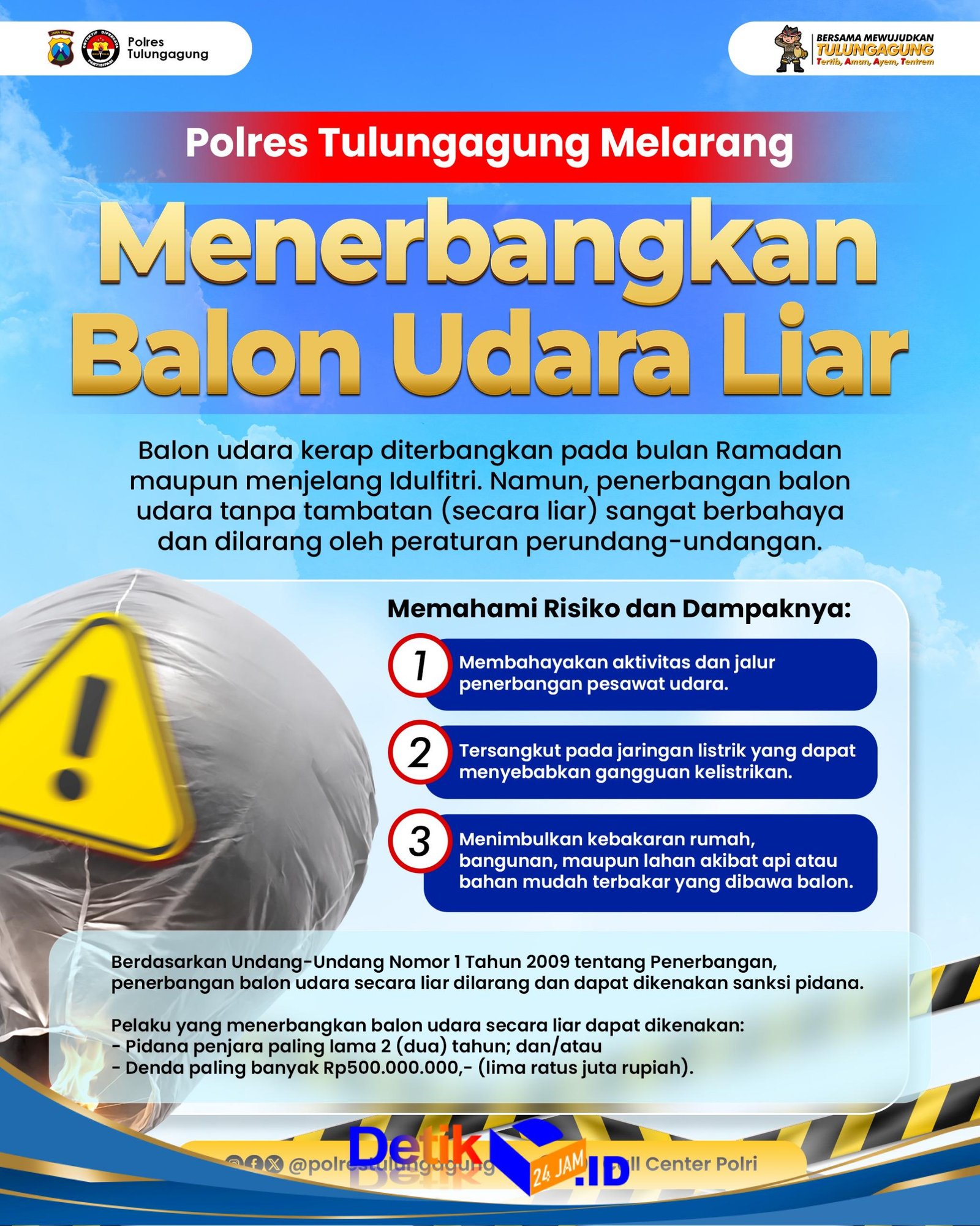 TULUNGAGUNG || Detik24jam.id – Polres Tulungagung Polda Jawa Timur, menghimbau serta melarang tidak ada lagi balon udara yang diterbangkan, baik saat bulan puasa, Lebaran, maupun pada hari-hari lainnya.