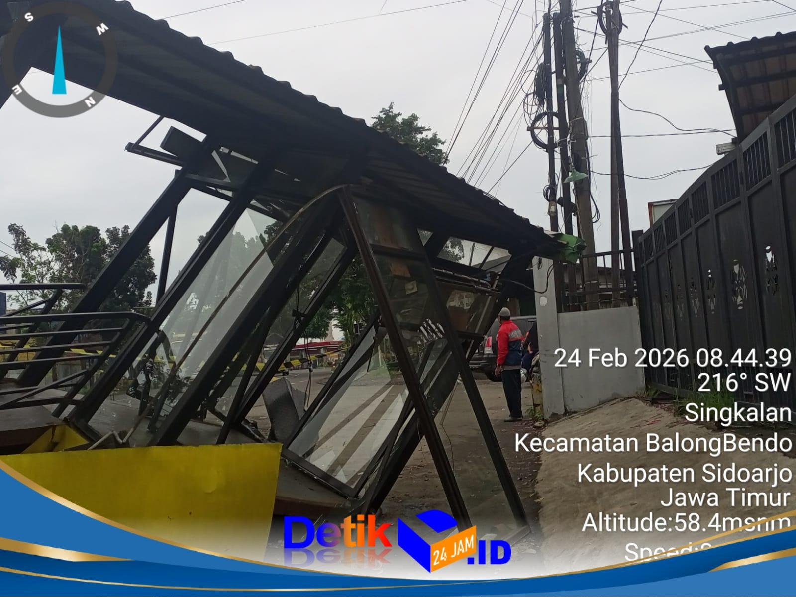 Akibat benturan keras, bagian atap dan tiang penyangga halte mengalami kerusakan serius.