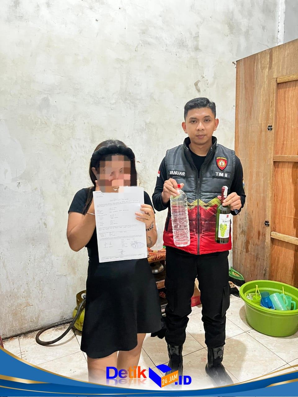 Dari lokasi tersebut, petugas mengamankan seorang perempuan berinisial MP beserta puluhan barang bukti Arak Bali, Atlas, Kawa-Kawa, Anggur Merah, Api, Guinness, dan Arak Tuban.