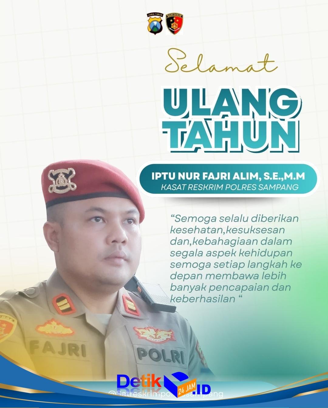 Sampang || Detik24jam.id — Kami Segenap Redaksi Media Online Detik24jam.id mengucapkan Selamat Ulang Tahun yang ke-38 Kepada Iptu Nur Fajri Alim SE MM, Kasat Reskrim Polres Sampang