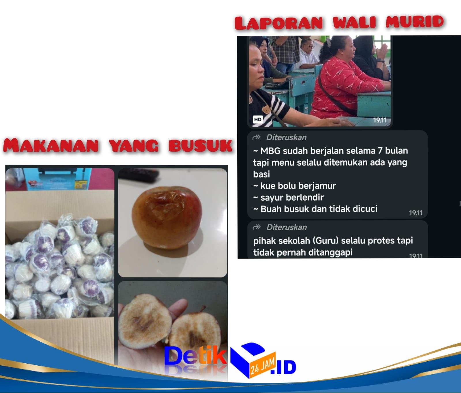 “Program MBG ini sudah berjalan sekitar tujuh bulan, tapi kami sering menemukan makanan yang basi. Ada kue bolu berjamur, sayurnya berlendir, dan buahnya busuk bahkan tidak dicuci,” ungkapnya kepada awak media sambil menunjukkan foto dan rekaman video.