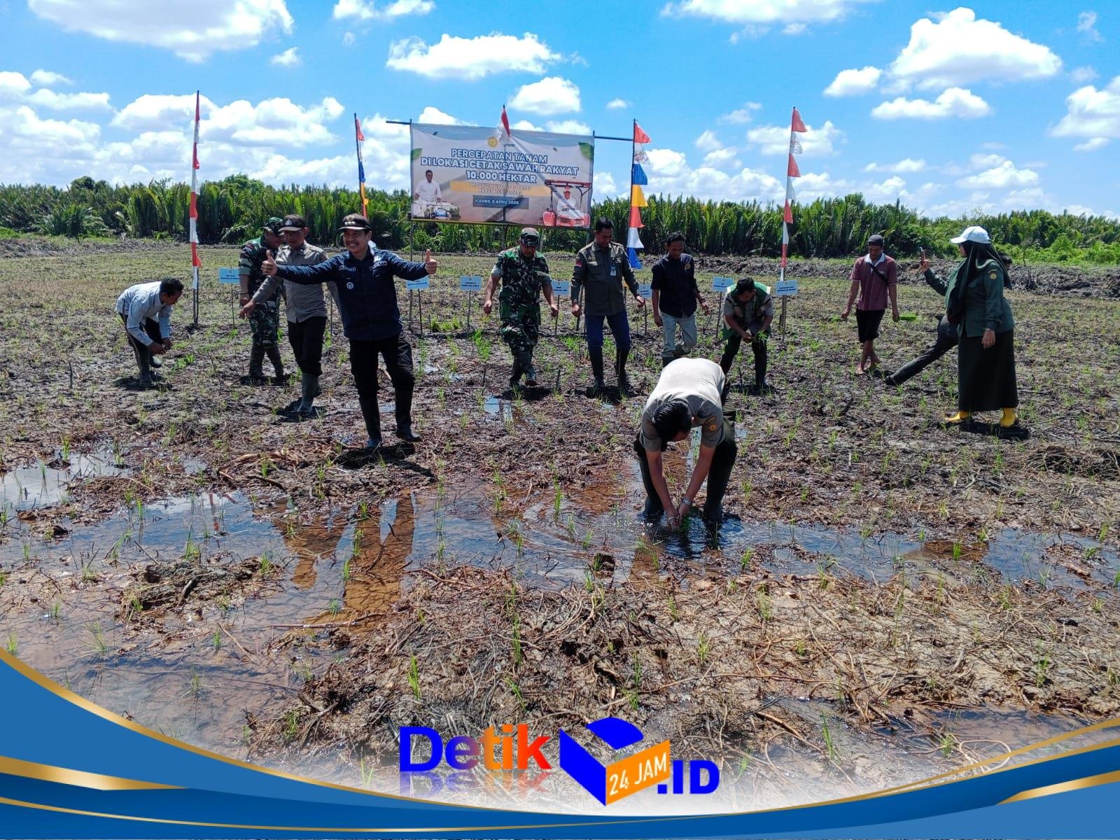 Kegiatan berlangsung dengan penuh semangat dan kebersamaan, ditandai dengan penanaman padi secara simbolis oleh para pejabat yang hadir bersama para petani.