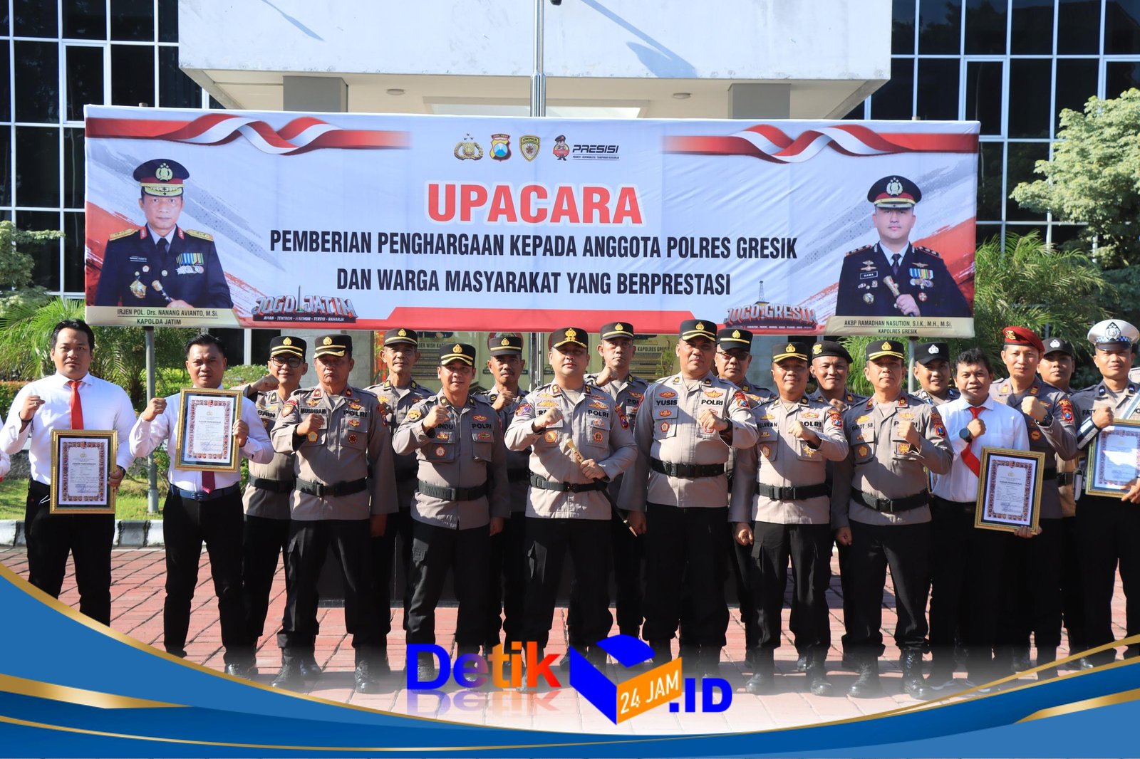 GRESIK || Detik24jam.id – Kepolisian Resor (Polres) Gresik memberikan apresiasi kepada personel berprestasi dan masyarakat yang turut berkontribusi dalam mendukung tugas kepolisian. Penghargaan tersebut diserahkan dalam sebuah upacara yang berlangsung khidmat di halaman Mapolres Gresik, Selasa (14/4/2026) pagi, dipimpin langsung oleh Kapolres Gresik, AKBP Ramadhan Nasution.