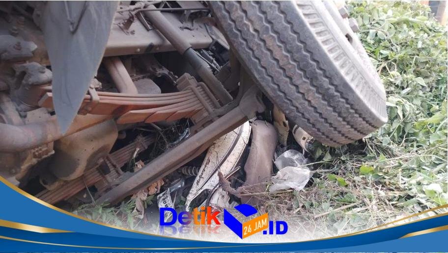 Benturan tersebut membuat pengemudi truk tronton kehilangan kendali hingga membanting setir ke kiri dan akhirnya masuk ke parit di pinggir jalan.