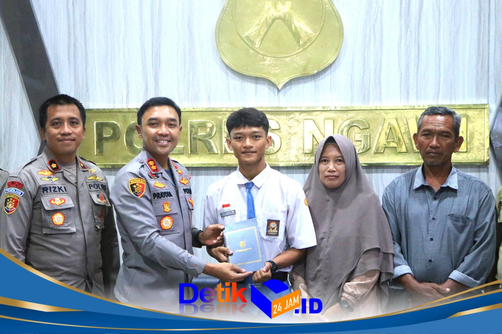 Dalam kesempatan itu, Kapolres Ngawi memberikan motivasi kepada Mujadidi Faizha Adhim untuk tetap semangat dalam mengharumkan nama daerah dan bangsa di kancah internasional.