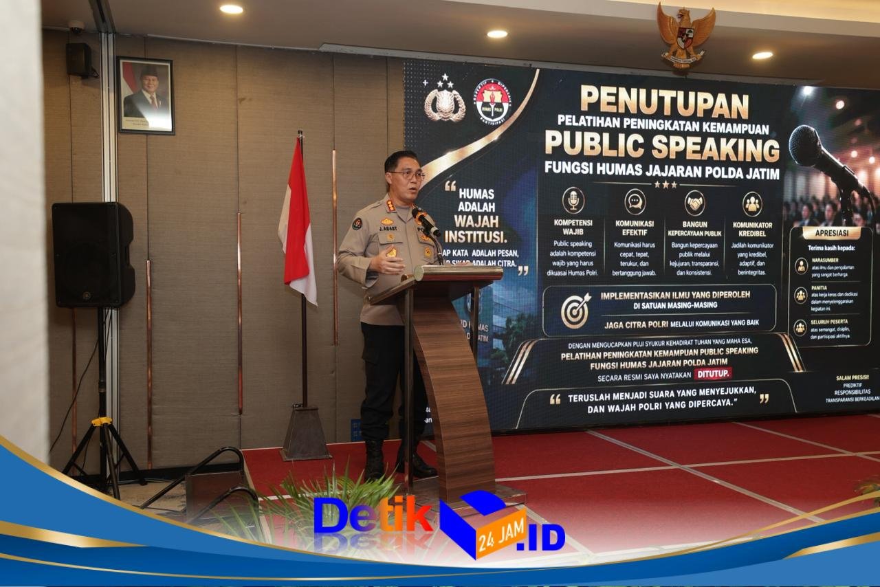 SIDOARJO || Detik24jam.id – Kepala Bidang Hubungan Masyarakat (Kabid Humas)Polda Jawa Timur, Kombes Pol Jules Abraham Abast resmi menutup kegiatan Pelatihan Peningkatan Kemampuan Public Speaking Fungsi Humas Jajaran Polda Jatim Tahun Anggaran 2026 yang digelar di Sidoarjo, Rabu (29/4/2026).